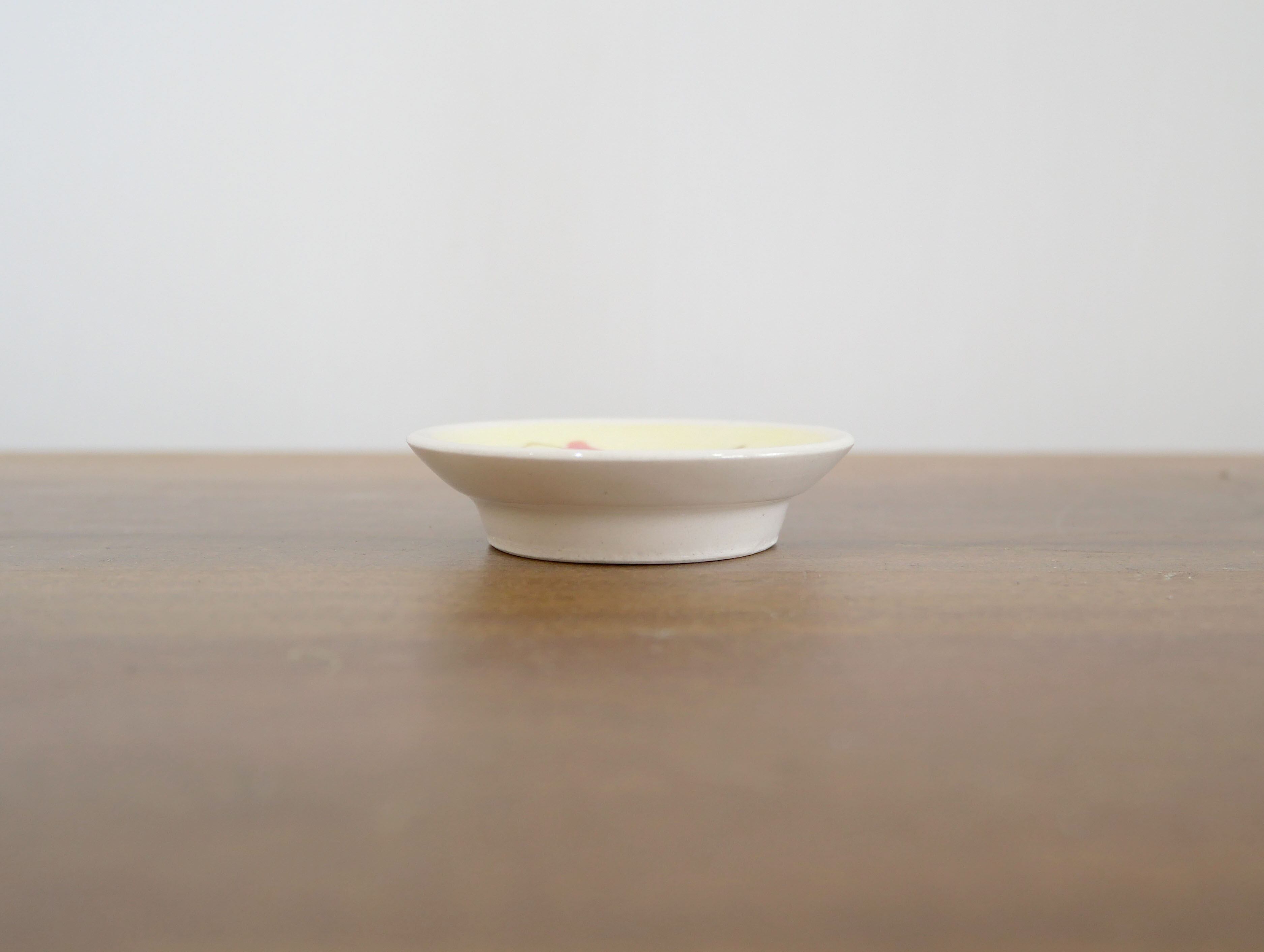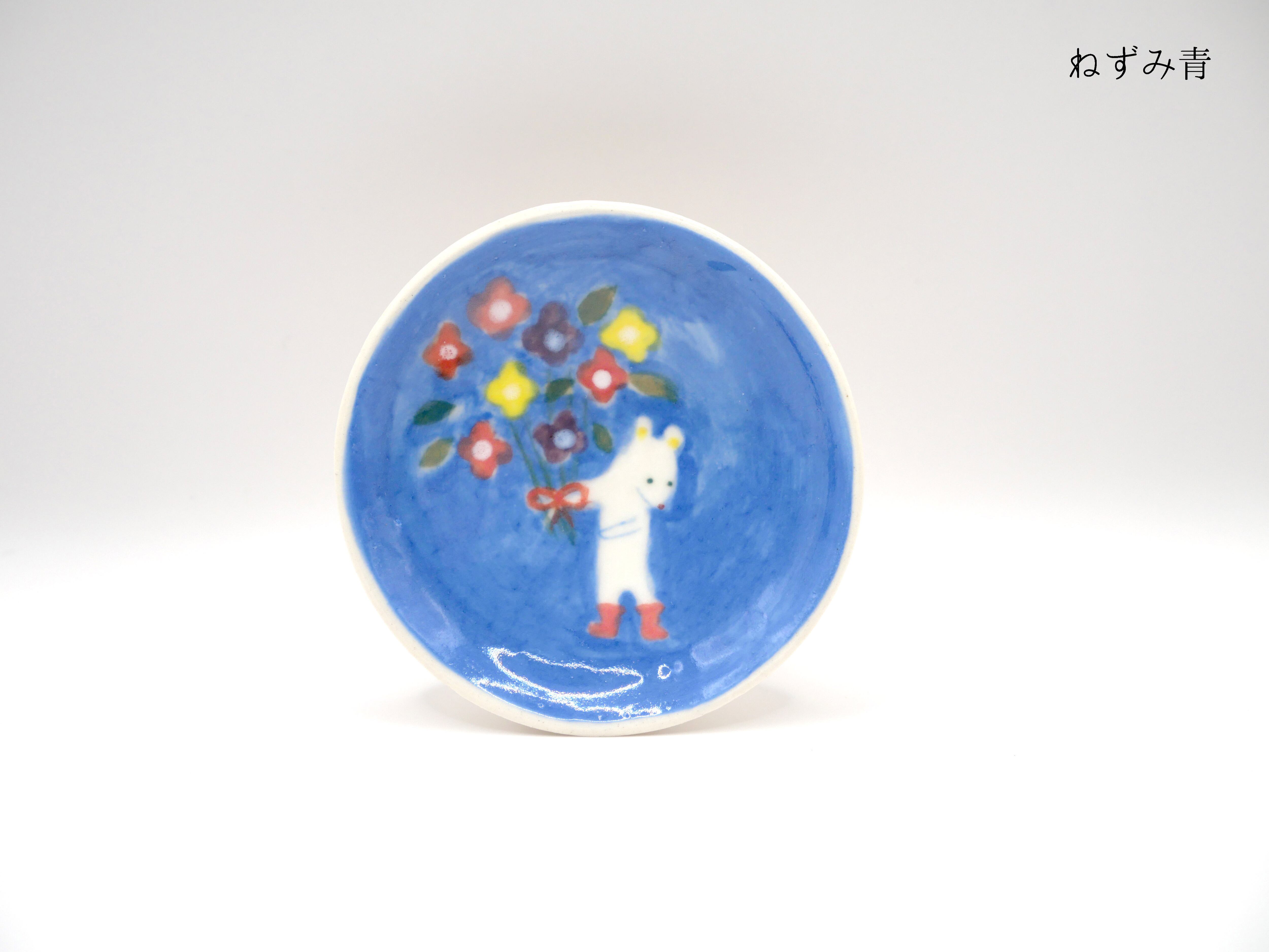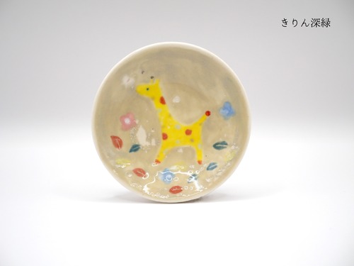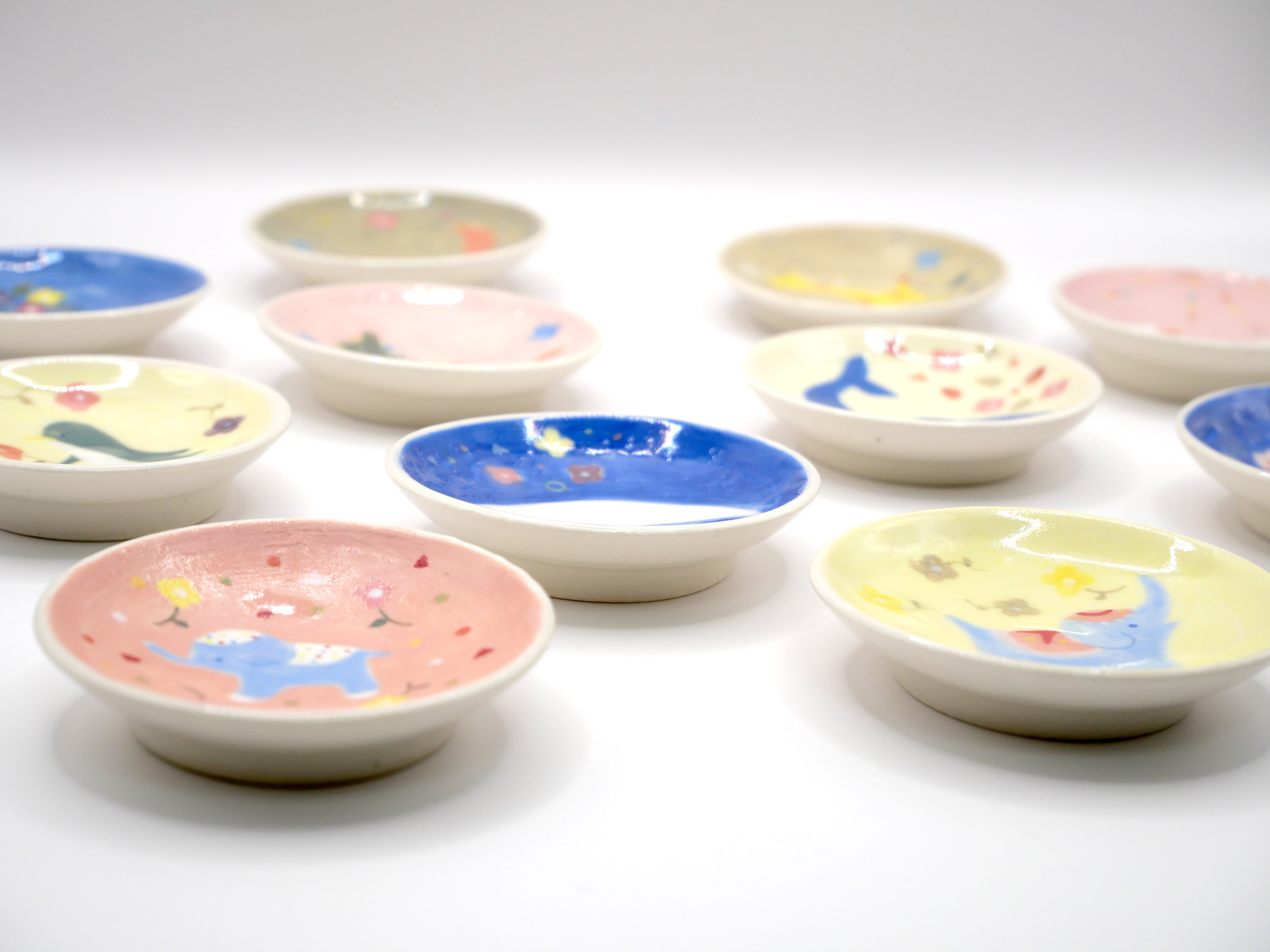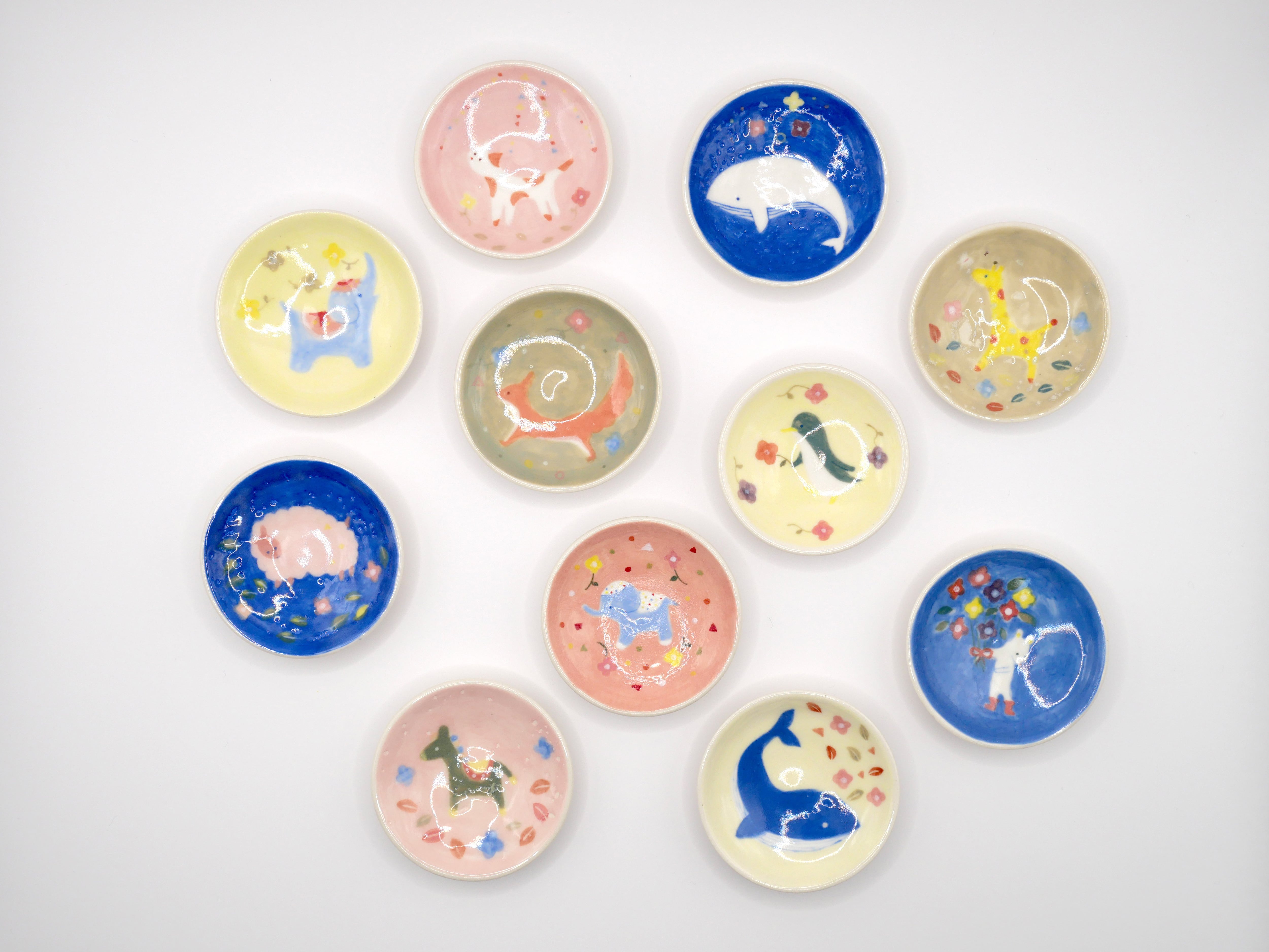 かわいい動物たちがカラフルに描かれた「豆皿」です。下絵具を使用し、一つ一つ丁寧に絵付した一点物のお皿です。釉薬をほどこしているのでお料理をのせて使用することもできます。飾って楽しむこともでき、生活を彩ります。